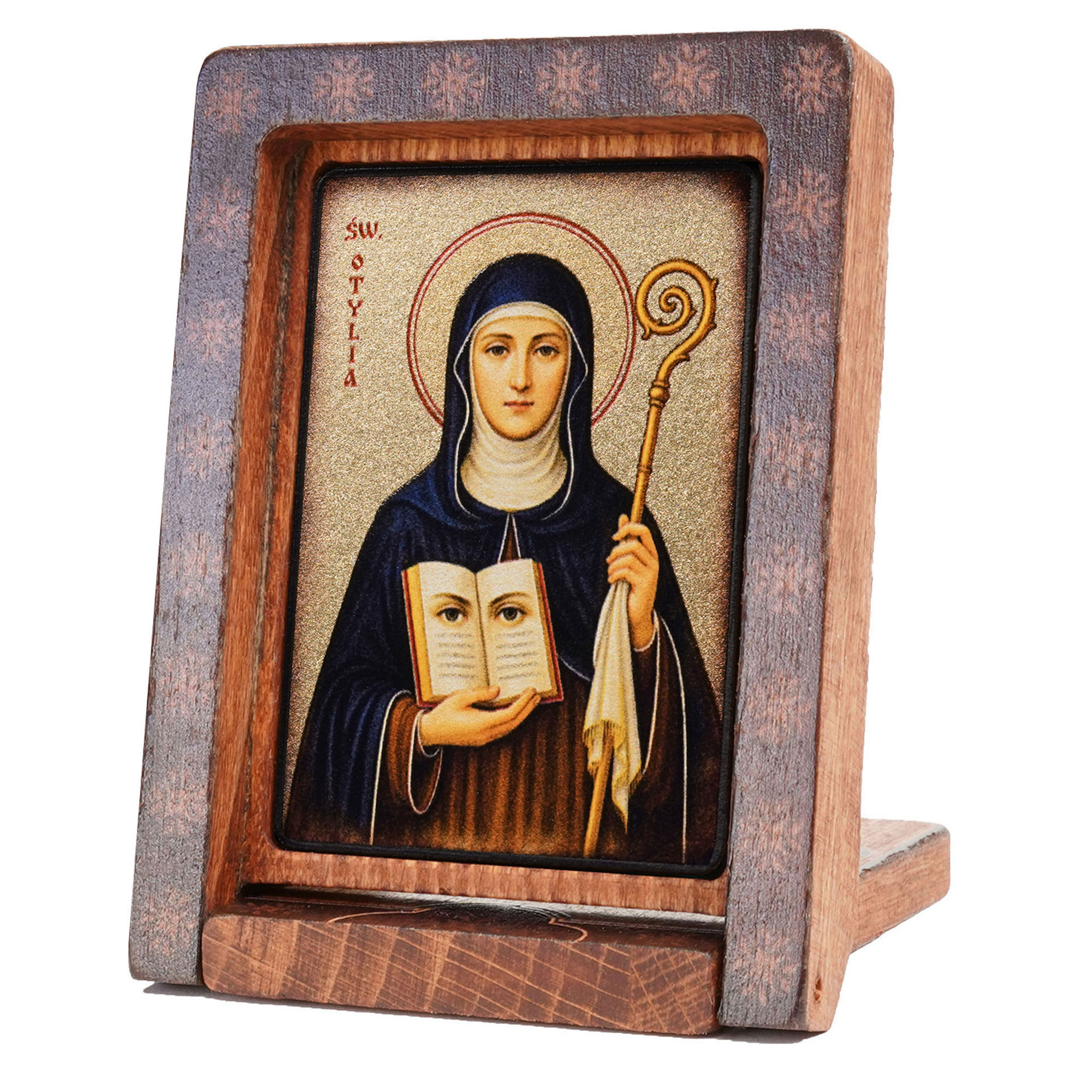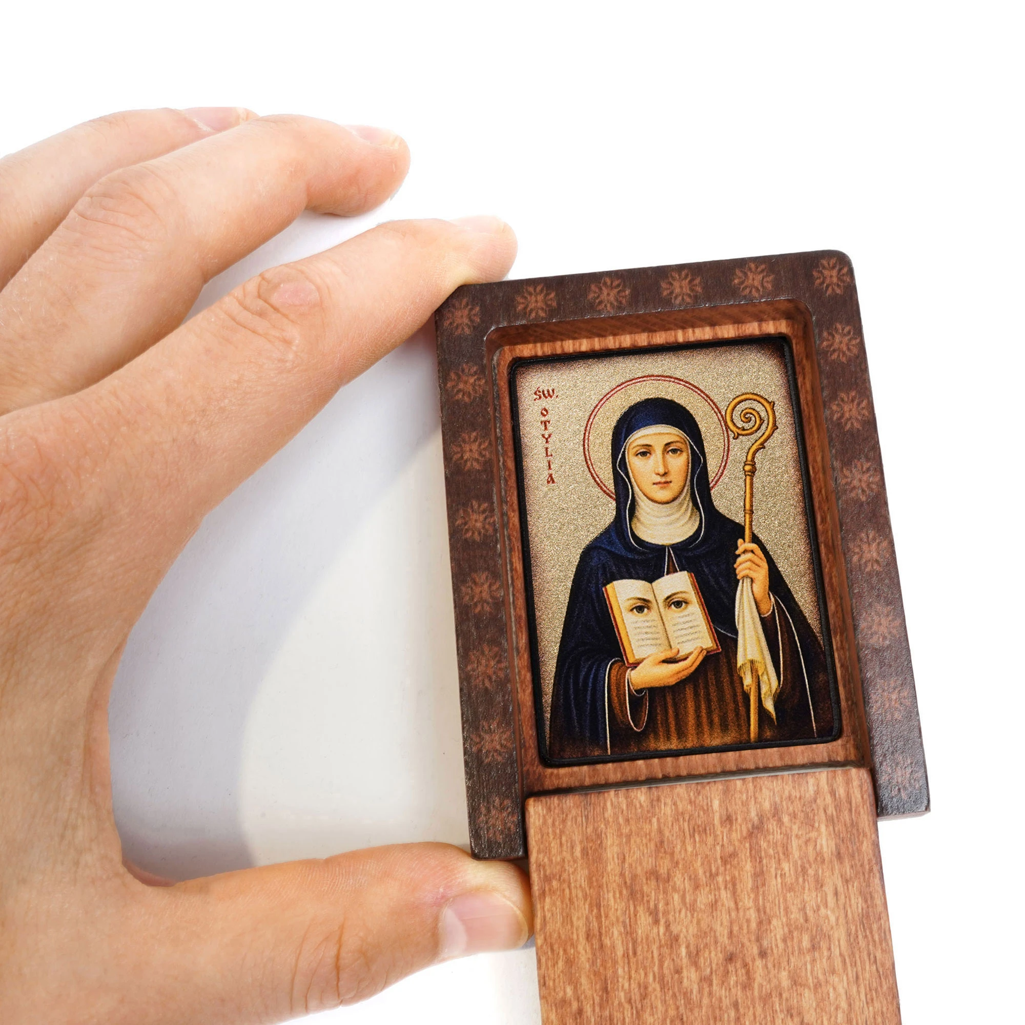 Wykonana z sercem i modlitwą w Pracowni Artystycznej MAJK, ta podróżna ikona Świętej Otylii to owoc tradycyjnego polskiego rękodzieła. Każdy detal – od złocenia po gładkość drewna – to świadectwo precyzji i intencji.